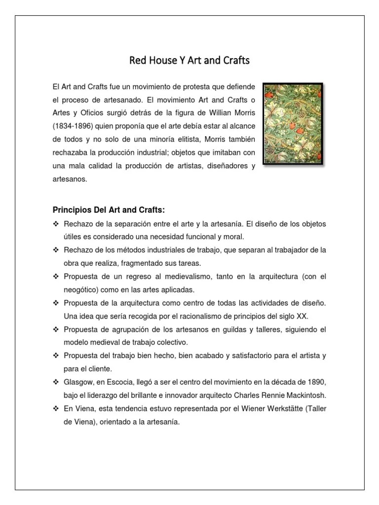 Este movimiento surgió en las últimas décadas del siglo xix como reacción contra el primer estilo industrial, que se había desarrollado en inglaterra a lo largo de esa centuria.. Toma inspiración de la obra de john ruskin, y tuvo su mayor expresión entre 1880 y 1910. Él acuñó el término y fue el miembro de los prerrafaelistas más interesado en la manualidad, retomar el modo de hacer de la edad media, huyendo de la revolución industrial. Vocabulario básicos movimientos artísticos culturales y filosóficos. Fue un hombre polifacético (artesano, impresor, poeta, escritor, activista, político y diseñador británico) fundador del movimiento arts and crafts. El movimiento, sus características y el impacto en su tiempo y en la actualidad".. En mi opinión es bastante interesante el concepto que maneja este movimiento, me parece genial que le tomen importancia a algo que mucha gente no le toma, que es la belleza de un objeto y el trabajo que hay detrás de él, hace del diseño un arte, con lo cual concuerdo, hace que los.