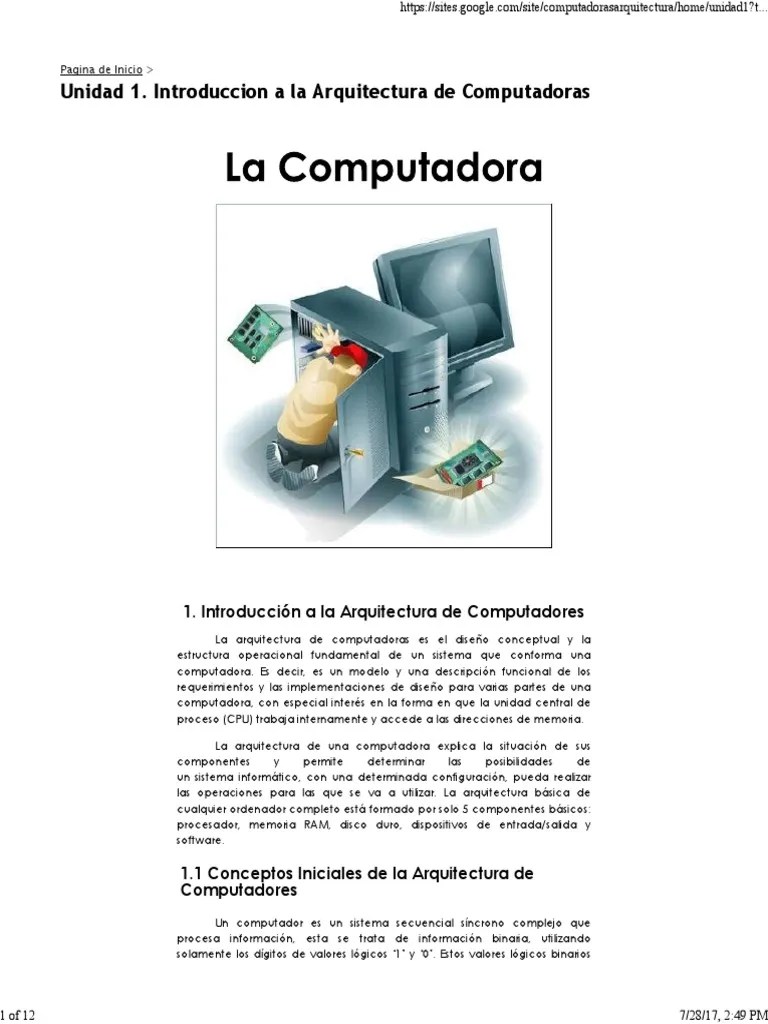 Fundamentos de la arquitectura computacional 1.1 concepto de arquitectura en el entorno informático 9 1.2 definición de computadora 9 1.3 organización física de una computadora 1.3.1 dispositivos de entrada 11 1.3.2 dispositivos de salida 12 1.3.3 memoria interna y memoria externa 13. Brevemente éstos son los elementos básicos: Arquitectura básica de una computadora : Arquitectura básica de una computadora 1. Una pc embebida posee una arquitectura semejante a la de un pc. Ruth katherine preciado castillo instituto técnico industrial n mantenimiento 2. A continuación, se plantea la arquitectura básica de una computadora, usando una máquina elemental didáctica para facilitar la apropiación de los conceptos... Microprocesador es el encargado de realizar las operaciones de cálculo principales del sistema.