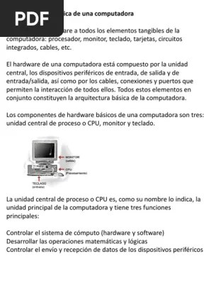 El hardware de una computadora está compuesto por la unidad central, los dispositivos periféricos de entrada, de salida y de entrada/salida, así como por los cables, conexiones y puertos que permiten la.. Computadoras de un sólo núcleo. Procesador, monitor, teclado, tarjetas, circuitos integrados, cables, etc. 2 índice introducción 4 mapa conceptual 5 unidad 1.